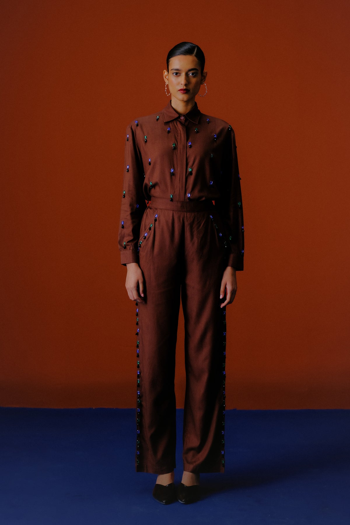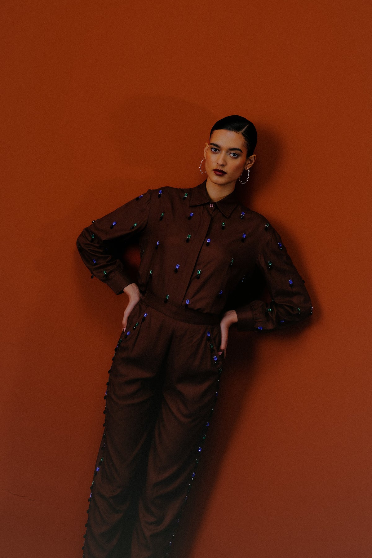 The Cocoa Pants are as comforting as a warm cup of hot chocolate on a winter day—special, soft, and full of charm. Embellished with crystals and emerald-toned stones, they add a subtle festive sparkle that’s perfect for winter soirées and cozy outings alike. Pair them with the Cocoa Shirt for a beautifully coordinated, effortlessly elegant look.