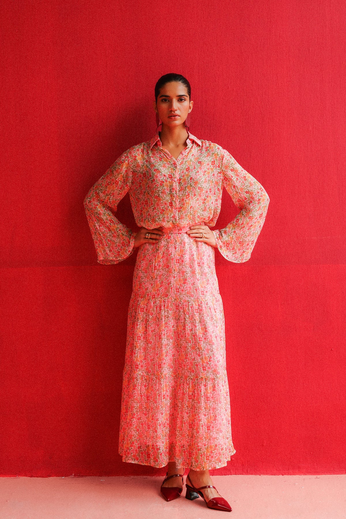 Designed in lightweight chiffon with a flattering, easy silhouette, the Cento Shirt blends comfort with effortless style. Its vibrant print and breezy feel make it perfect for both casual days and dressed-up moments. Pair it with the Cento Skirt for a coordinated look that’s fresh, feminine, and full of charm.