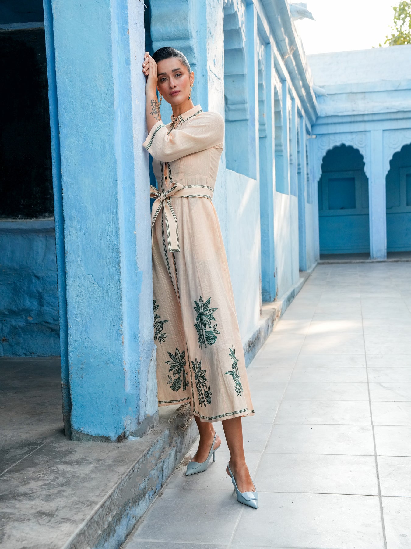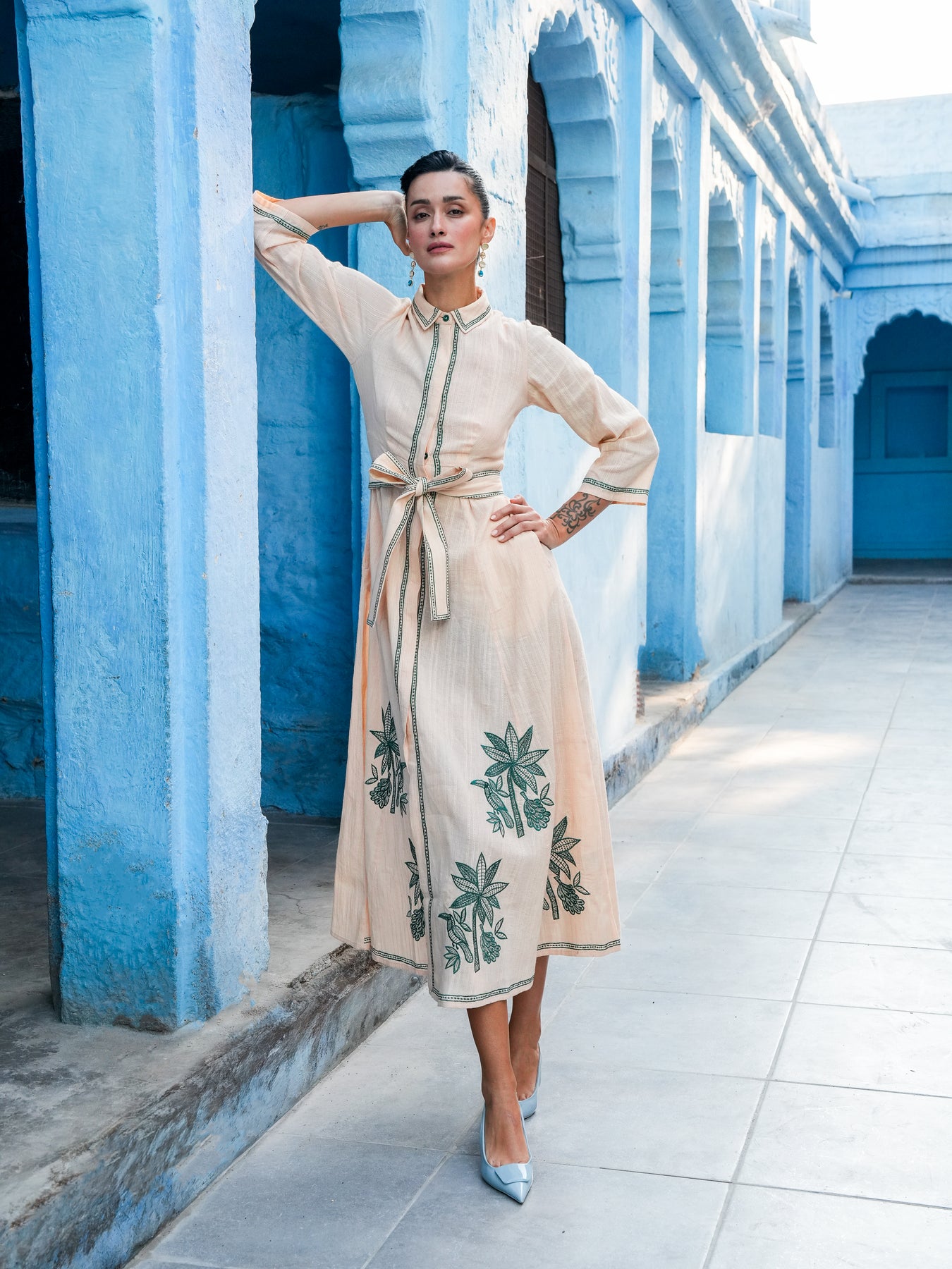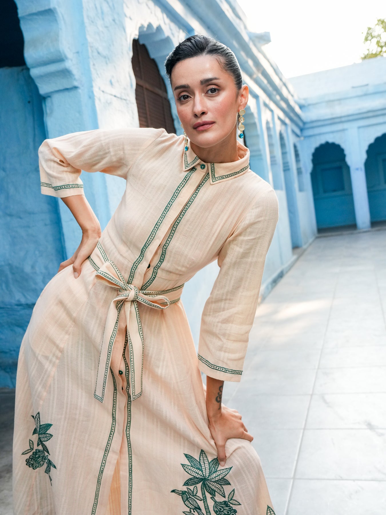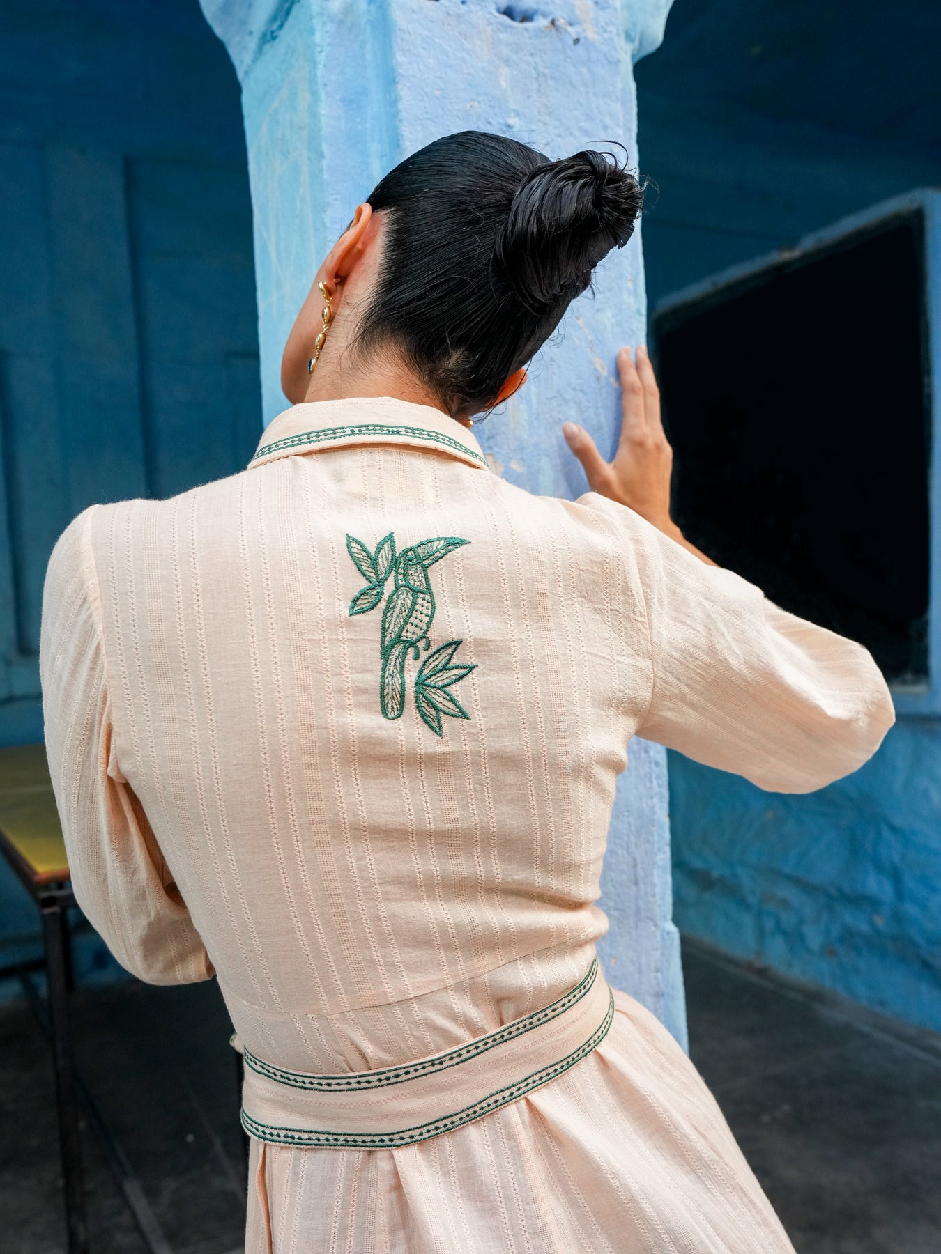 Delicate flora and fauna embroidery brings a sense of artistry to its fluid silhouette. Cinched at the waist and effortlessly refined, it moves seamlessly from formal moments to sunlit days out.