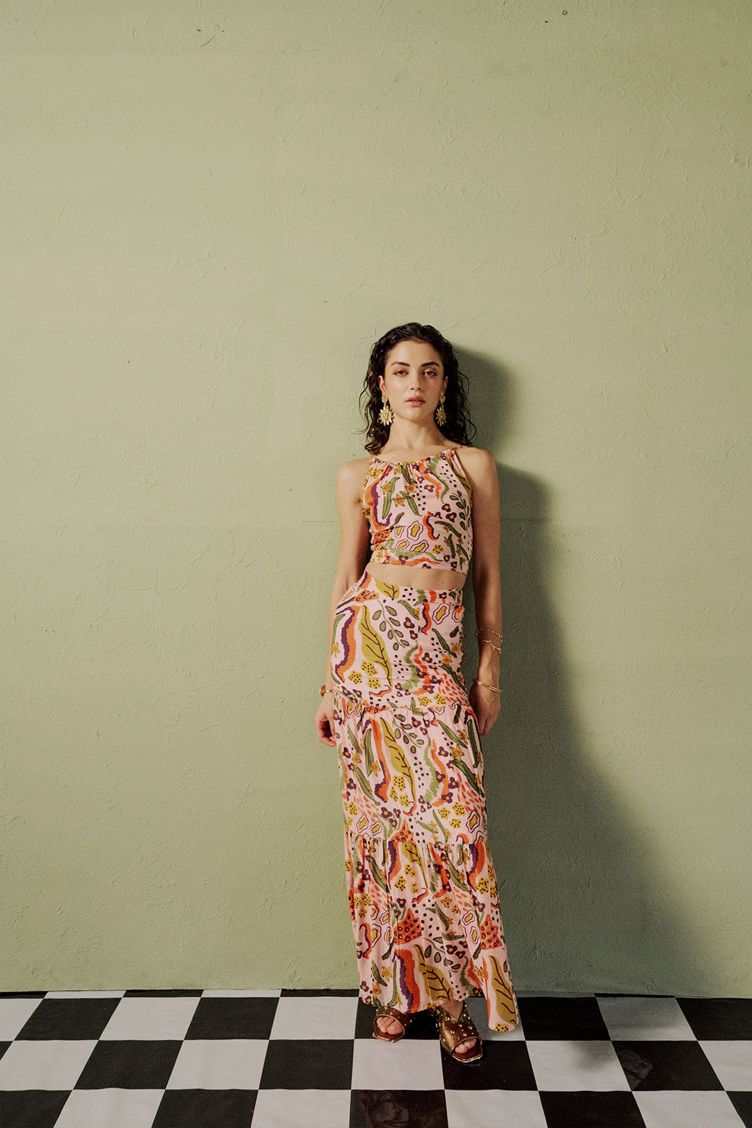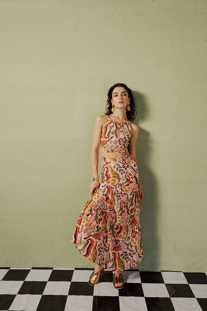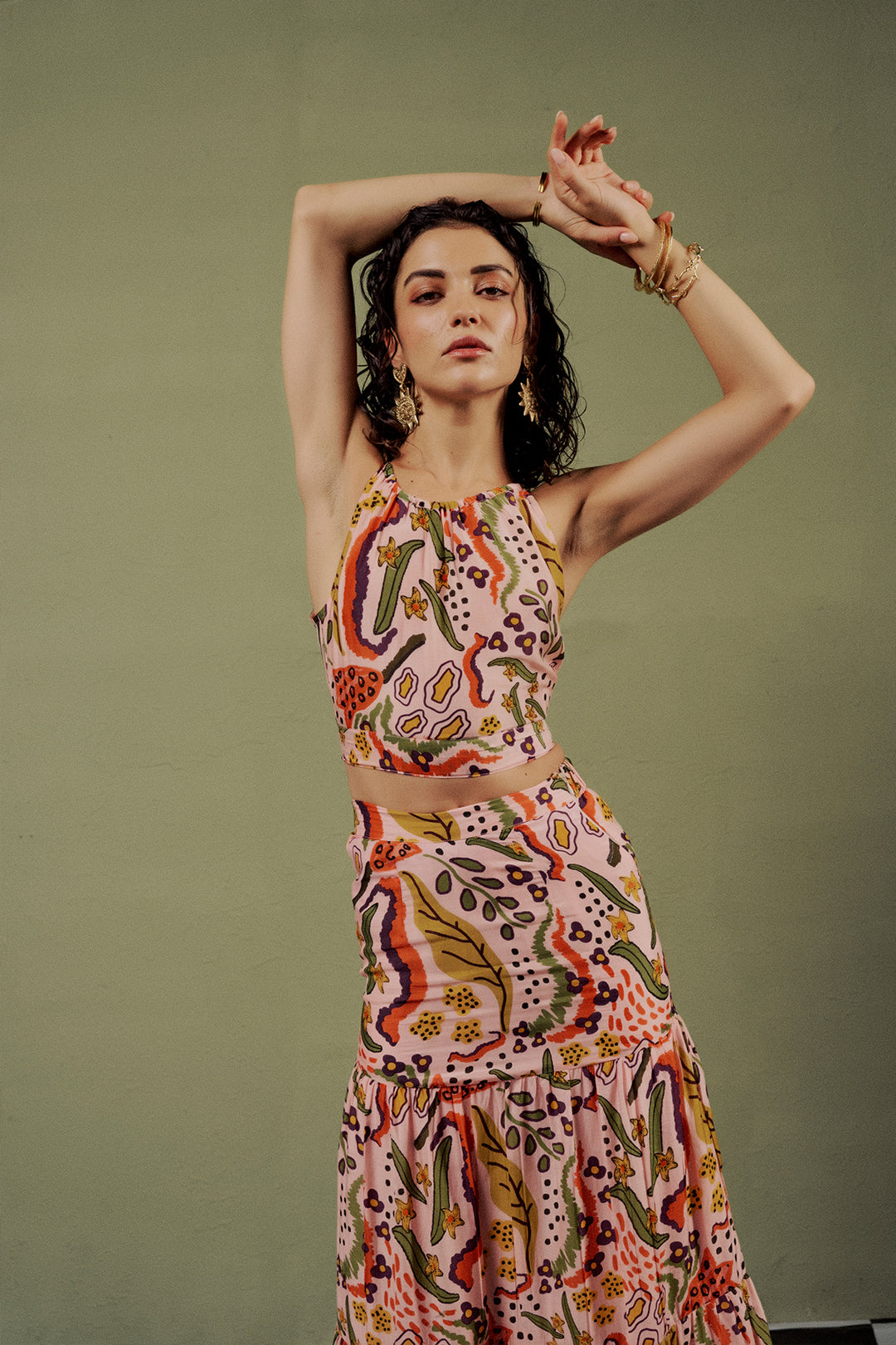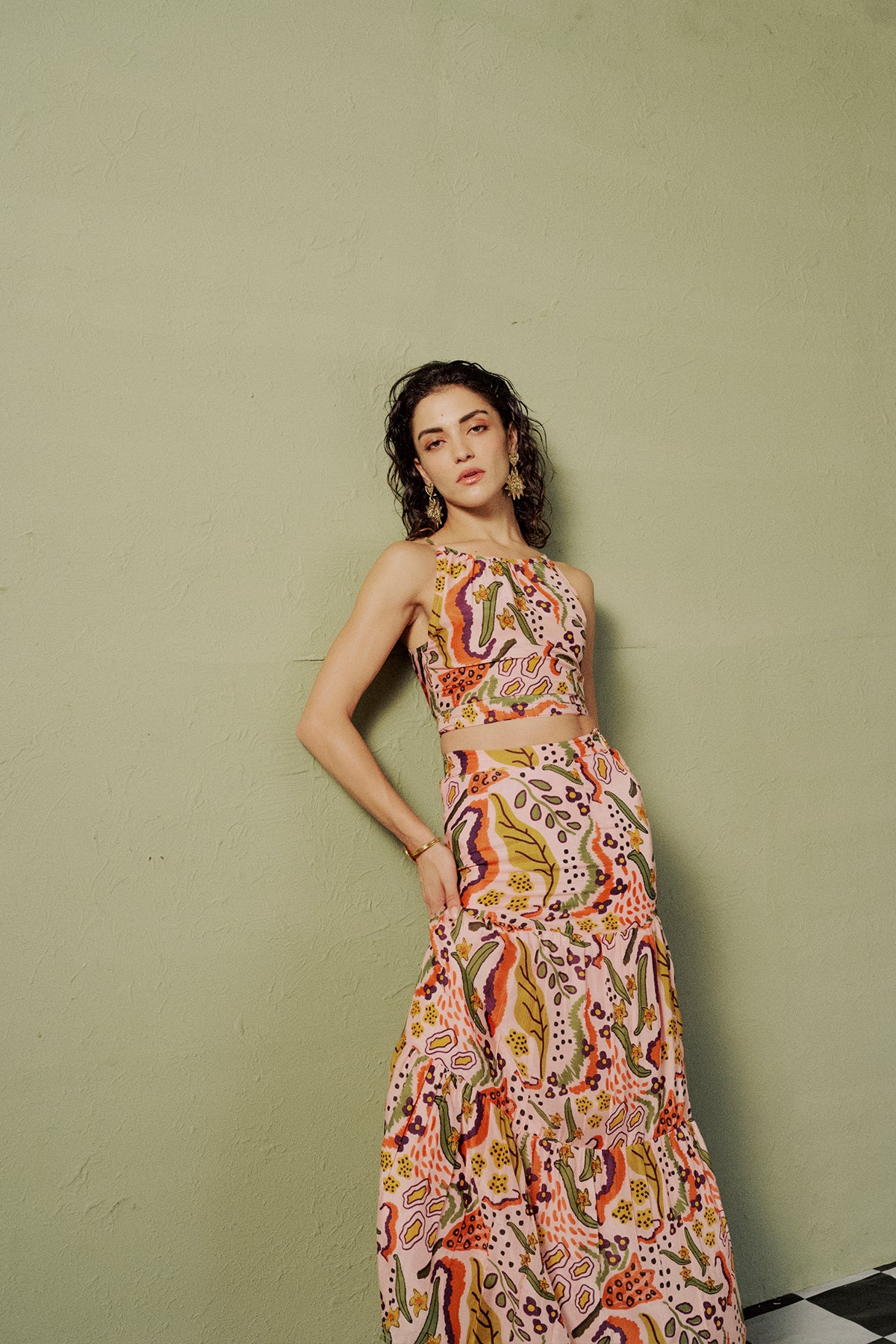 Occasion dressing gets a playful upgrade with the Tanzia Skirt, crafted in vibrant, mood-lifting hues for an effortlessly standout look. Its flowing silhouette adds elegance with ease, making it perfect for any elevated setting. Pair it with the matching Tanzia Blouse and gold accessories for a chic, statement-making ensemble.